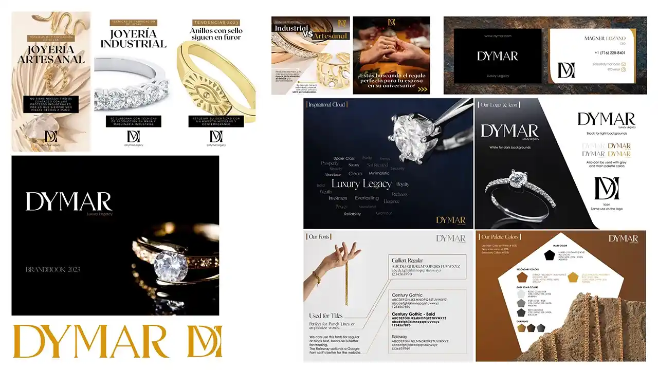 Dymar – Luxury Legacy Diseño de marca para una empresa de venta de joyas importadas de oro con piedras preciosas como esmeraldas colombianas. NICHO: Joyería UBICACIÓN: Texas, USA